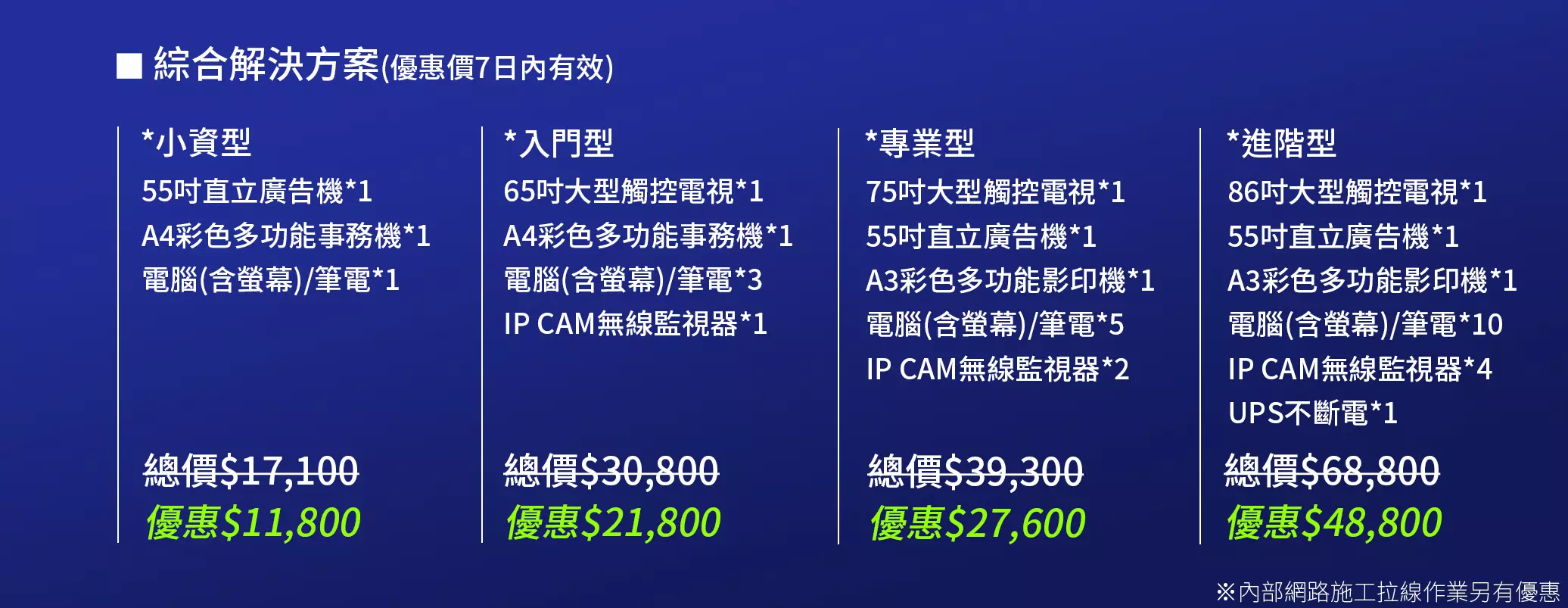電腦/筆電、印表/影印機、NAS/企業信箱、網路/防火牆、 UPS不斷電、 監視器、考勤門禁、廣告機、大型觸控電視(含電子白板) 、視訊會議及揚聲器系統、網路電話總機、網頁建置…等完整設備整合。